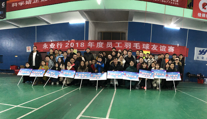 为进一步丰富公司员工业余文化生活,搭建职工互动交流平台,营造和谐永业行氛围。2019年1月26日,永业行组织开展了“永业行2018年度员工羽毛球友谊赛”由省内外各部门组成的11支队伍、86名男女运动员参加了本次比赛。 本届赛制采用混合团体赛,共设混双1、混双2、混双3共三个项目,比赛先采取抽签分组的形式,第一阶段进行单循环赛,第二阶段采取交叉淘汰赛最终决出前3名。 在比赛中,选手们遵循友谊第一、比赛第二的原则,团结一致,奋力拼搏,现场对决紧张激烈,比赛精彩纷呈。赛场上,换上运动装的员工,变成了