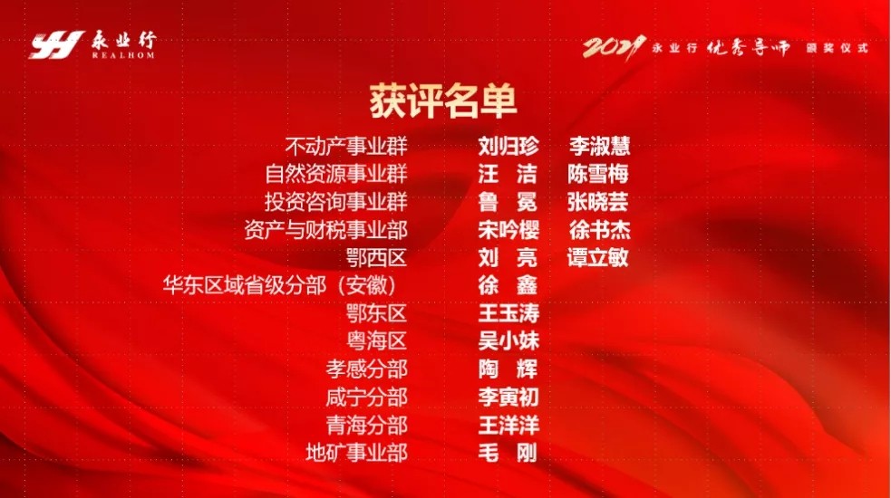 互促成长 薪火相传 永业行举办2021年“优秀导师”颁奖仪式 2021-09-30 9月29日下午,永业行在绿地办公区举办2021年“优秀导师”表彰仪式。永业行轮值总裁王琴,副总裁吴学锋、程为民,各获奖导师及学员参加活动。优秀导师代表和被培养学员代表共计30余人线上线下参会。 会上,业务骨干代表结合自身岗位就创新业务拓展、轮岗交流机制、总分业务联动、典型案例分享等展开演讲交流;鄂西区各小组负责人、板块业务总监围绕上半年部门人员结构、经营管理情况作详细汇报,对问题与不足进行深刻分析,并对下半年工作重点进行周密部署。 本次评选活动于2021年8月启动,经过申报、初评、终 MORE