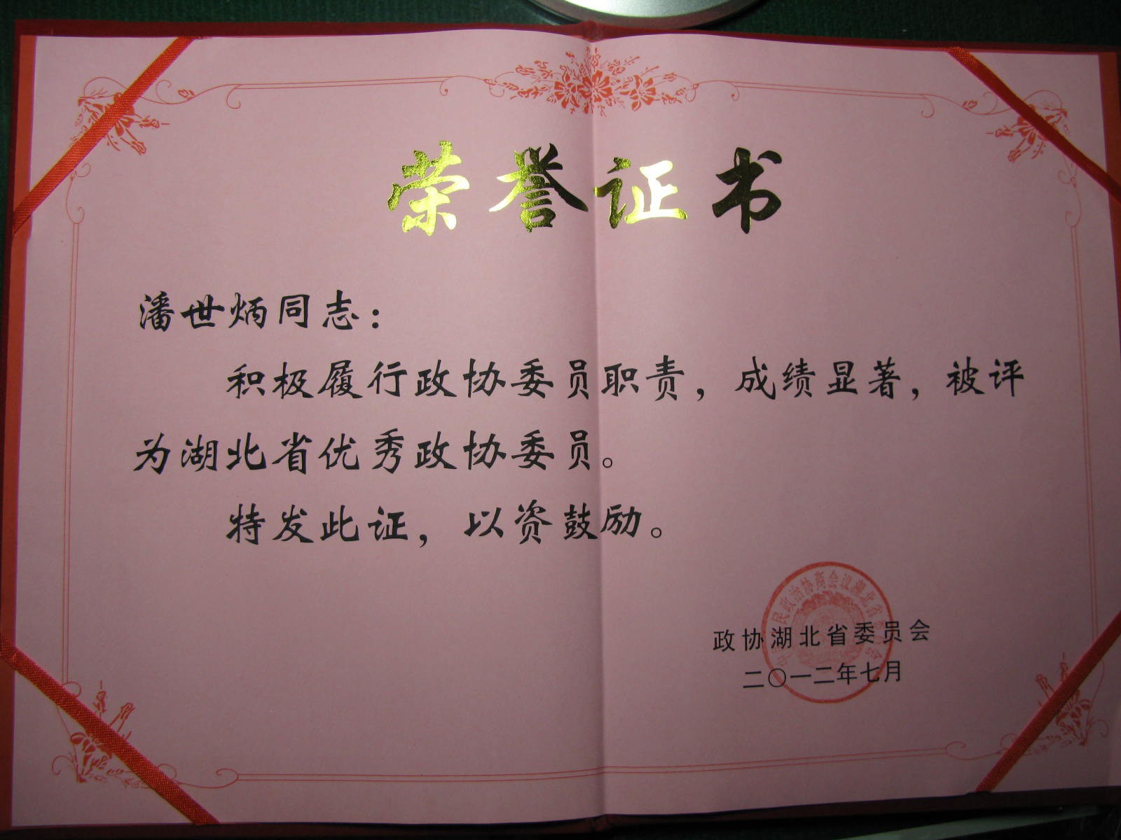 2012年7月19日,潘世炳被评为湖北省优秀政协委员