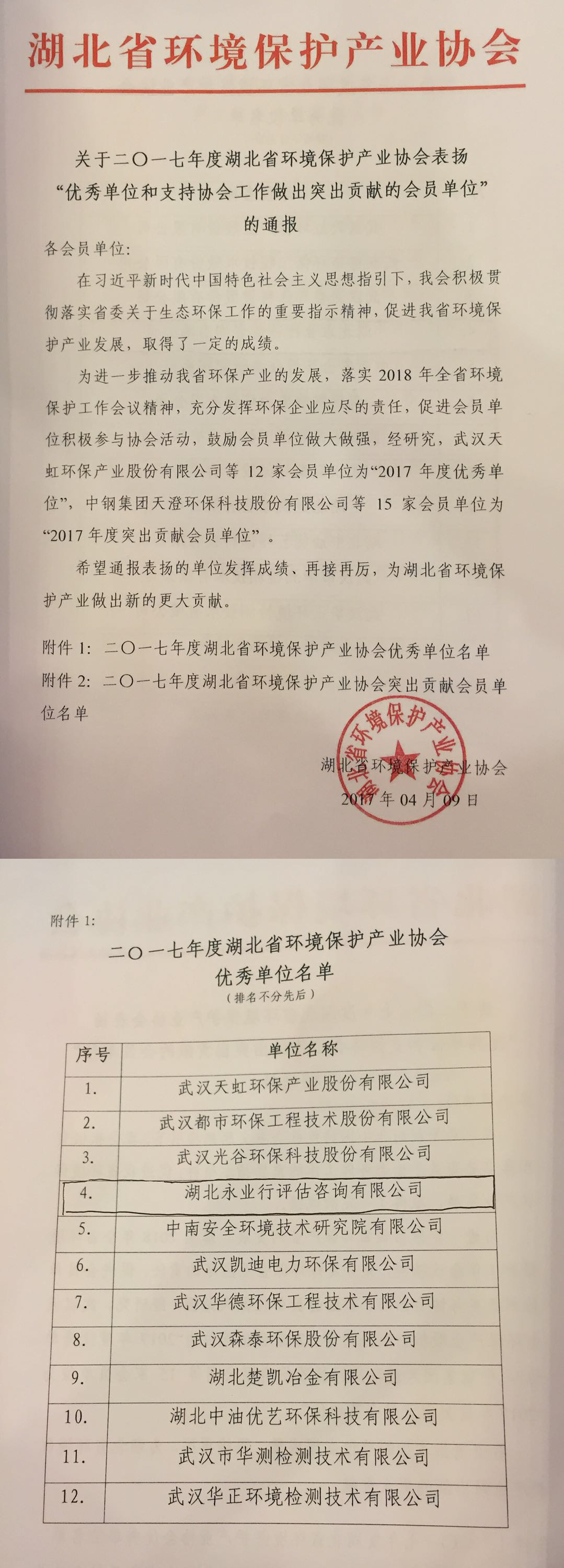 永业行获评2017年度湖北省环境保护产业协会优秀单位