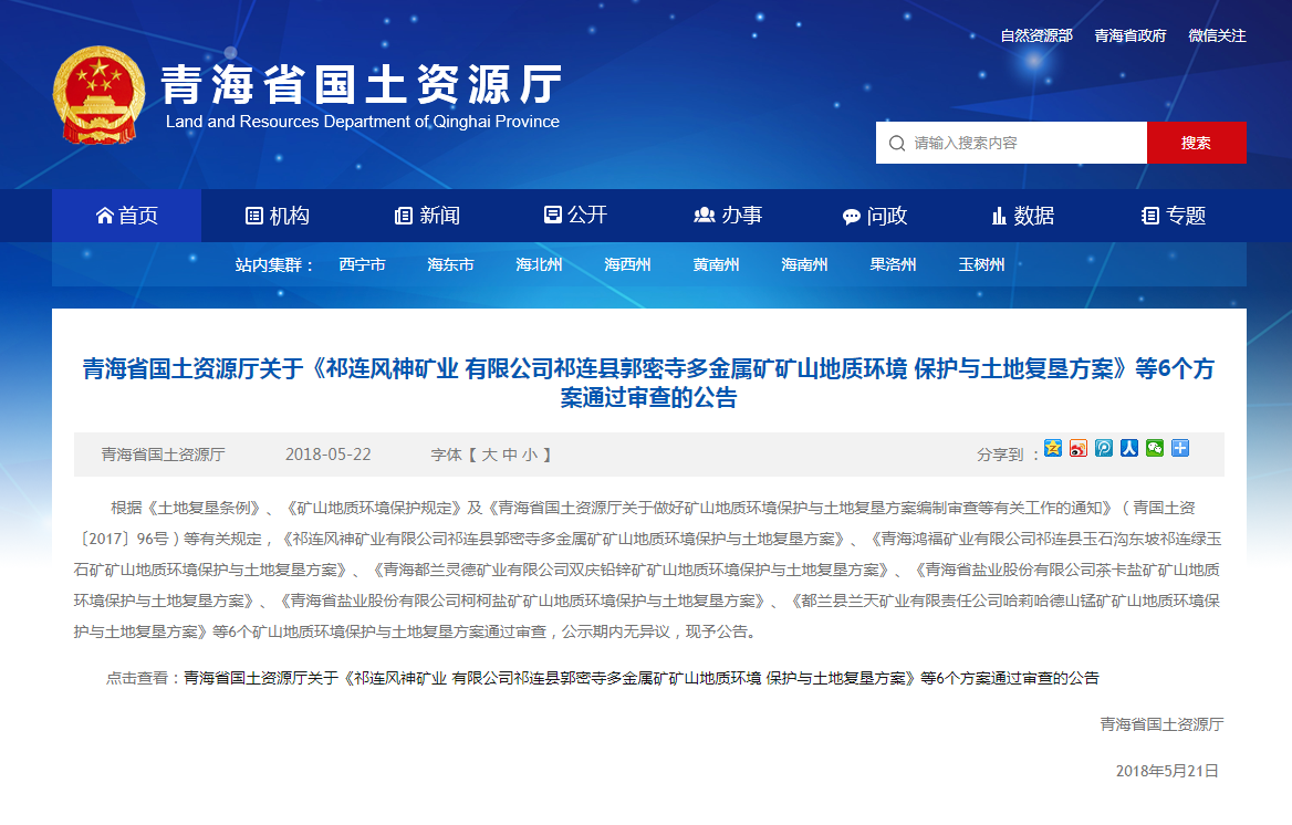 2018年5月22日,由永业行青海分公司承担的祁连县两个省级矿山《地质环境保护与土地复垦方案》(下称《方案》)经青海省国土资源厅公示无异后通过审查。