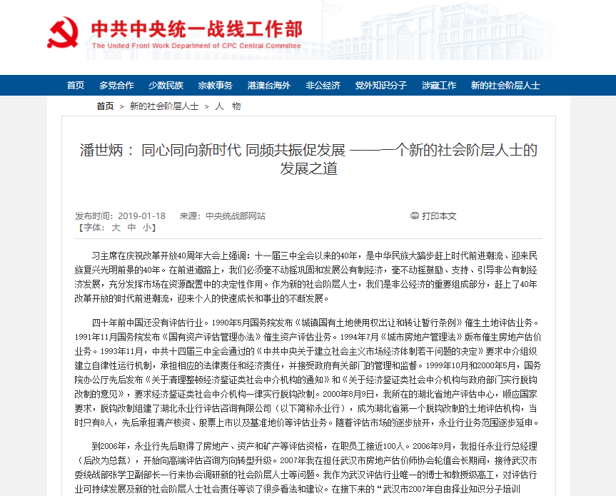 永业行潘世炳学习体会获中央统战部网站全文刊载