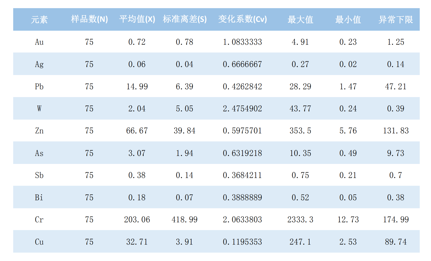 表1 沱沱河地区1号线地化剖面元素异常参数统计表