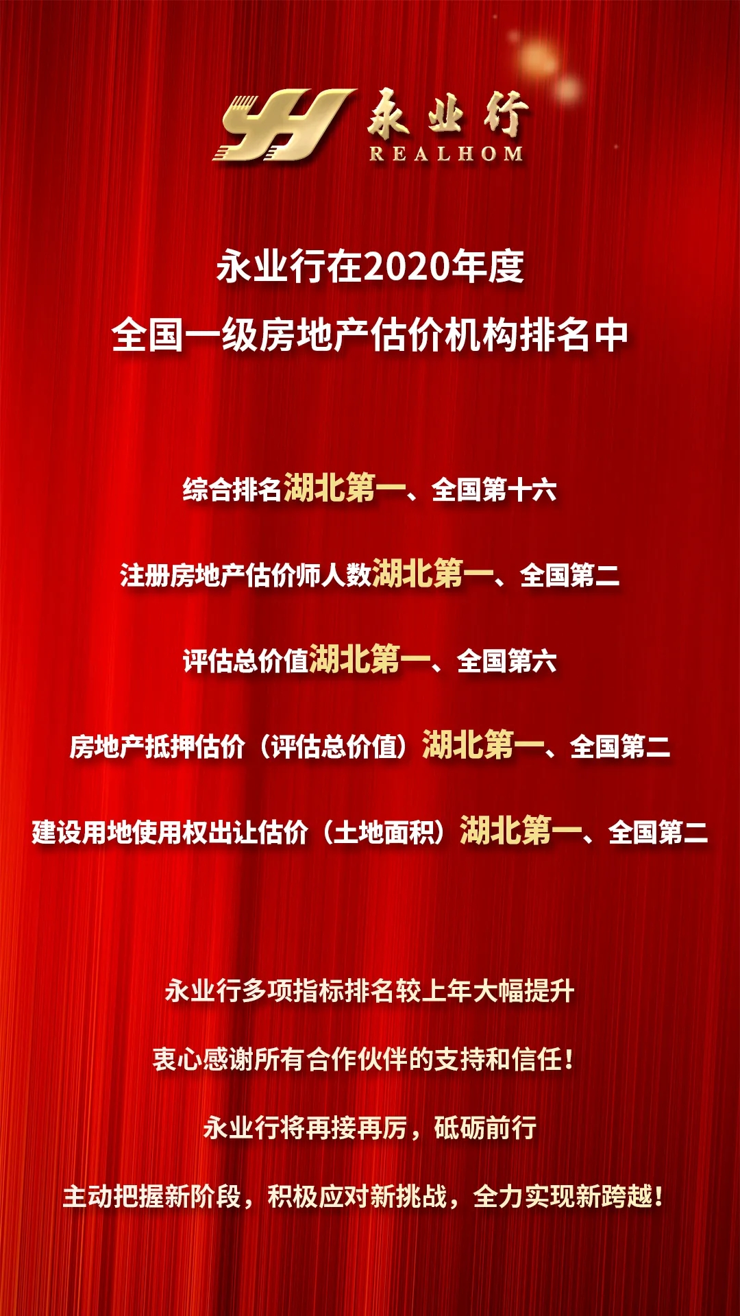 永业行集团下属永业行(湖北)土地房地产评估咨询有限公司综合排名位列湖北第一名!