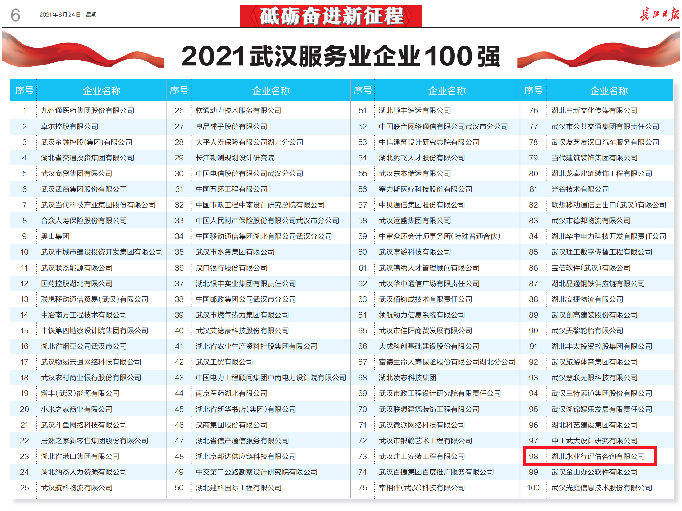 2021年8月23日,2021武汉企业100强榜单正式发布,永业行凭借良好的发展态势和经营业绩,连续四年上榜“武汉服务业企业100强”。