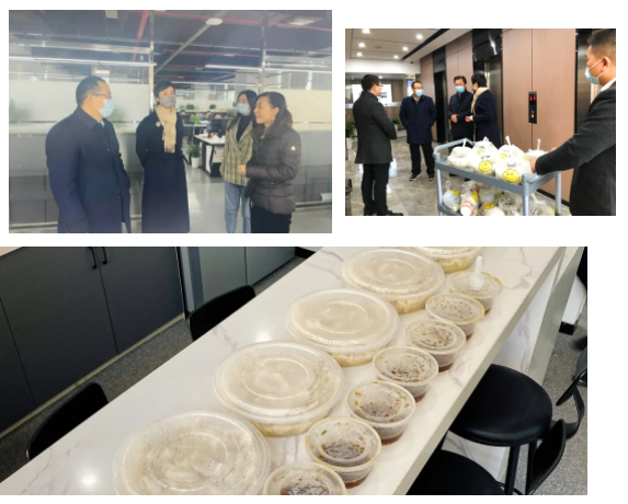 十点刚过,香喷喷、热乎乎的饺子和陈醋已经用餐盒包装好,整齐的码放在餐车上。潘世炳、王琴、程为民一行来到各个办公区,热情地将餐盒送到员工手中。每到一处,潘世炳与员工们亲切交谈,了解各部门年终项目进度及存在的问题和困难,对广大员工敬业奉献精神表示诚挚感谢,勉励大家坚定信心,克难攻坚,再接再厉做好年底冲刺,确保圆满完成全年目标任务并取得优异的成绩。同时,叮嘱大家要注重劳逸结合,保证身体健康。大家纷纷表示,一定切实履行工作职责,奋力加压,坚决打好年终冲刺攻坚战,以实际行动交出一份满意答卷。