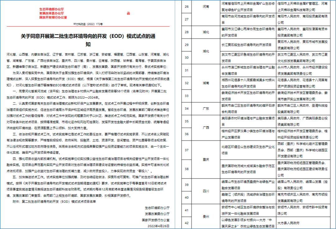 2021年10月,生态环境部、国家发改委、国家开发银行联合印发《关于推荐第二批生态环境导向的开发模式试点项目的通知》(环办科财函〔2021〕468号),征集第二批试点项目。2022年4月公布了我国第二批58个开展EOD模式试点工作的项目,期限2022-2024年。其中永业行参与的两个项目成功入选