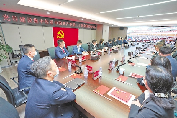 10月16日,武汉光谷建设投资有限公司党员代表集中收看党的二十大开幕会直播。(湖北日报全媒记者 魏铼 摄)