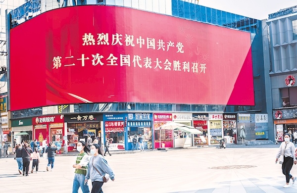 10月16日,武汉市江汉路步行街超大型电子显示屏循环播放标语,让市民们感受到了浓厚的盛会氛围。(湖北日报全媒记者 朱熙勇 摄)