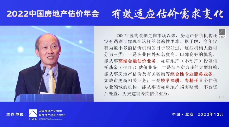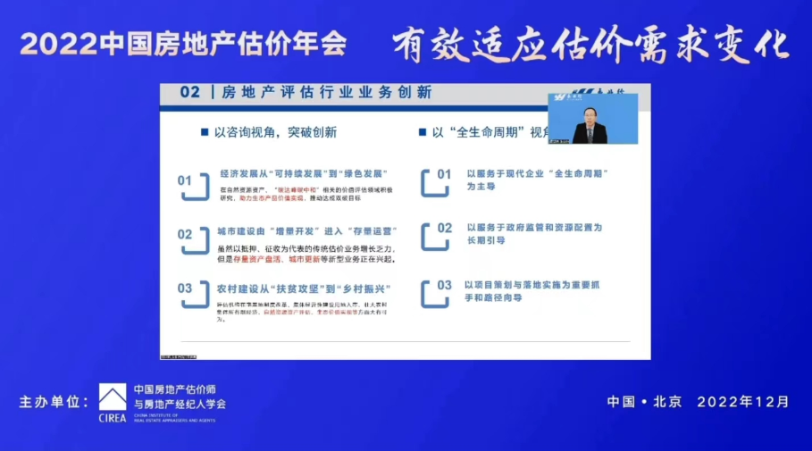 潘世炳在演讲中结合党的二十大精神以及国际国内宏观经济形势,分享了他对构建房地产评估行业发展新格局的思考。他对房地产评估行业发展的新形势、新要求进行分析,提出房地产评估行业要以传统评估和咨询业务为基础,衍生新的业务渠道,构建房地产评估行业发展的新格局。他指出房地产评估行业可从咨询视角出发,围绕“绿色发展”“存量运营”等方面进行业务创新;以服务现代企业“全生命周期”为主导,实现传统业务的提质升级。他同时提出,为做好估价机构内部管理,评估机构应不断丰富技术、市场、风控、管理、信息化、文化“六位一体”的管理体系,以管理创新作为推动评估行业发展的新举措。