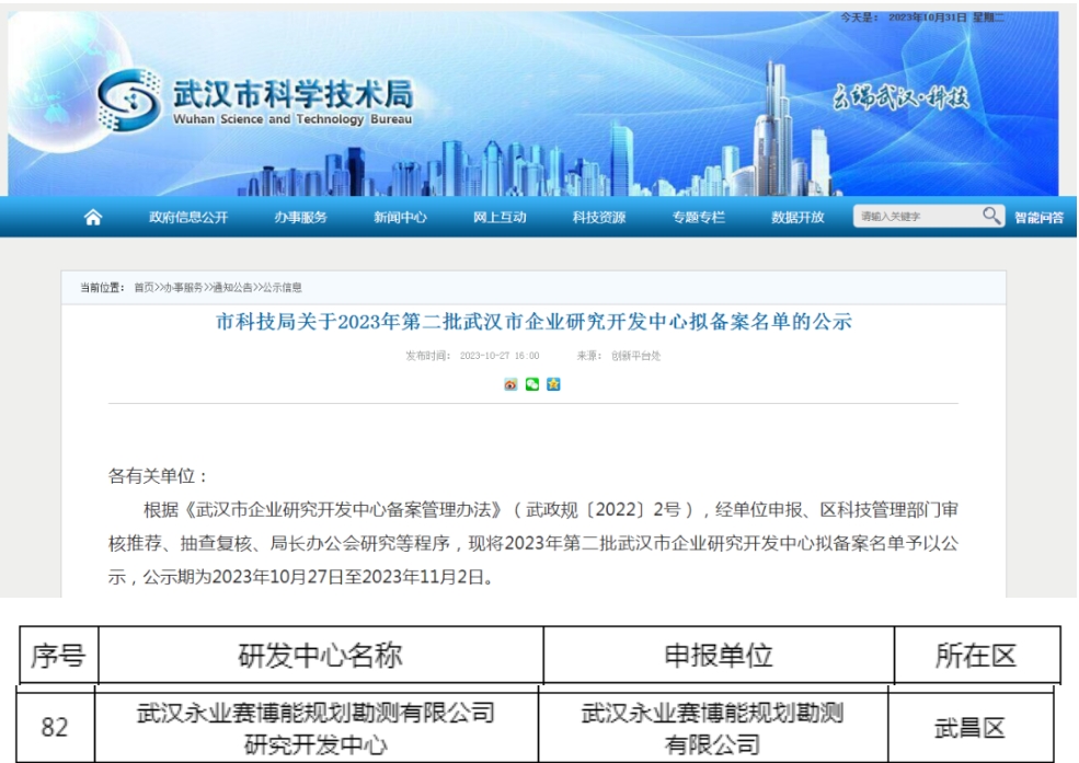 近日,武汉市科技局公示了2023年第二批武汉市企业研究开发中心拟备案名单,成员机构武汉永业赛博能规划勘测有限公司通过认定,这是继2018年永业行研发中心认定以来,再次获得备案,展现了集团在技术研发、科技成果方面的综合实力。