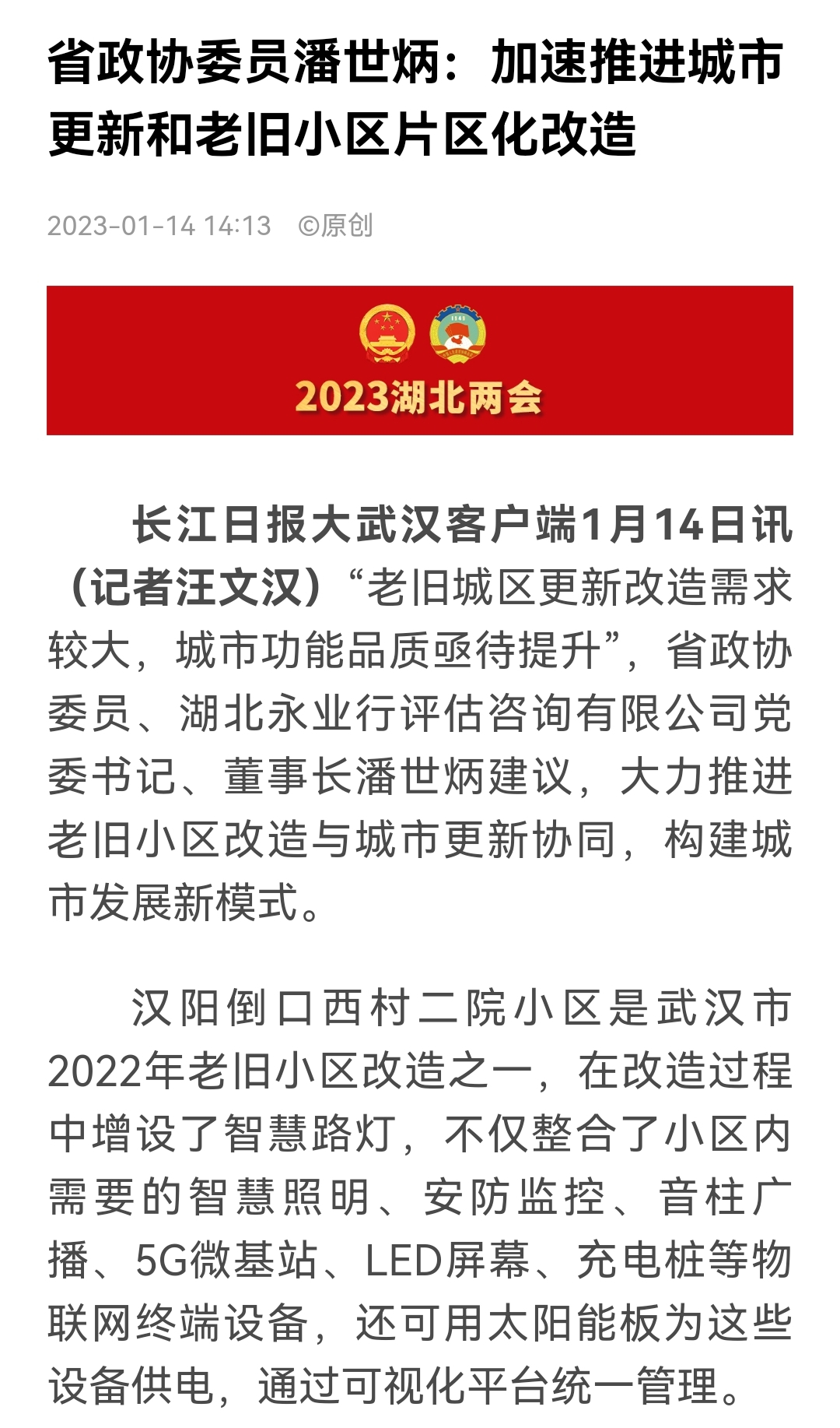 近日,省政协对十三届一次会议以来的30件好提案予以通报表彰。湖北省政协常委、永业行董事长潘世炳提出的《老旧小区连片改造 推进城市更新升级》提案,入选好提案名单。