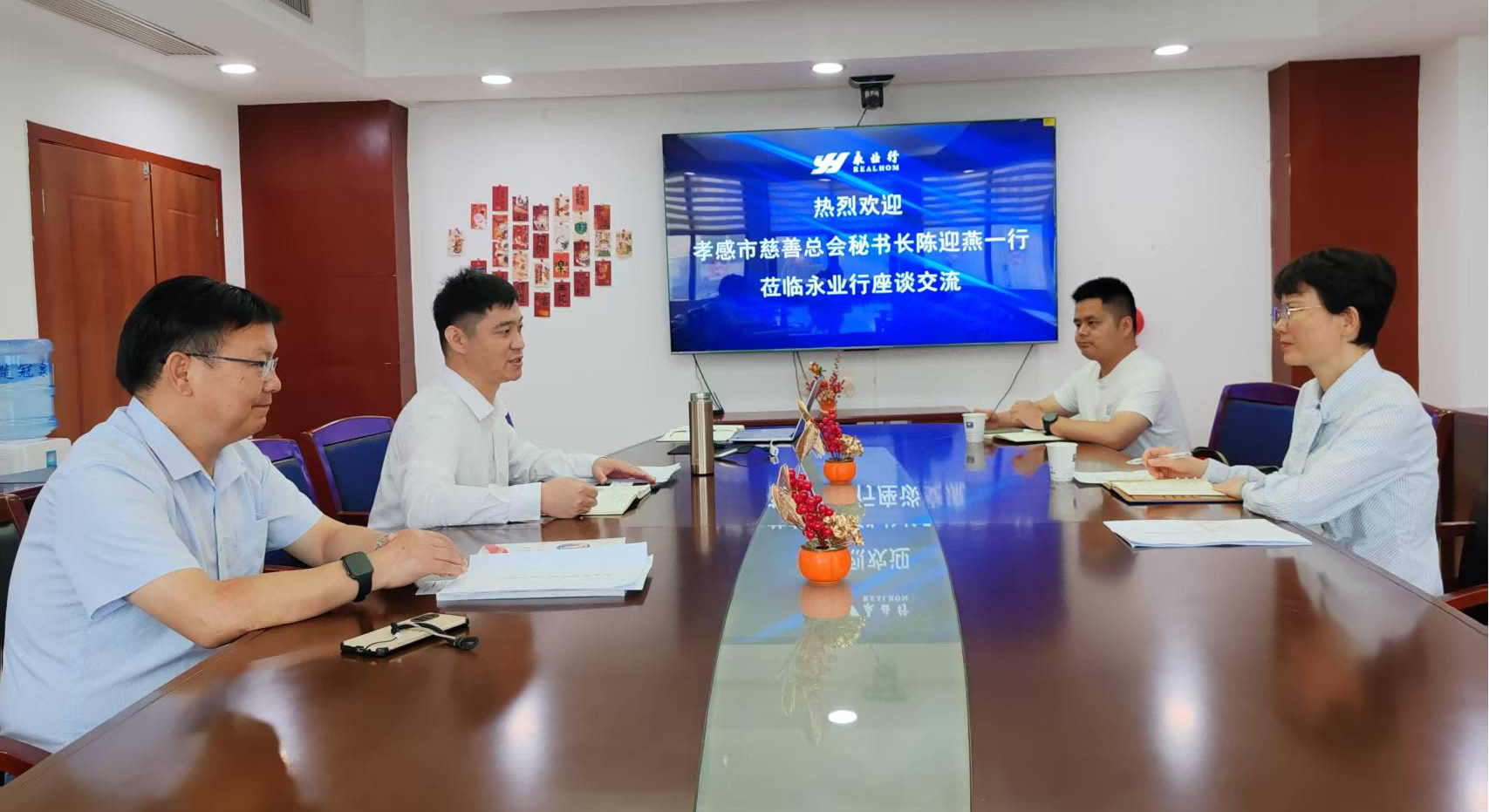 2025年5月14日,孝感市慈善总会秘书长陈迎燕一行莅临永业行孝感分部,就企业发展、慈善工作开展情况进行座谈交流。永业行孝感分部执行董事张立胜、总经理梁小虎热情接待并参加座谈交流。