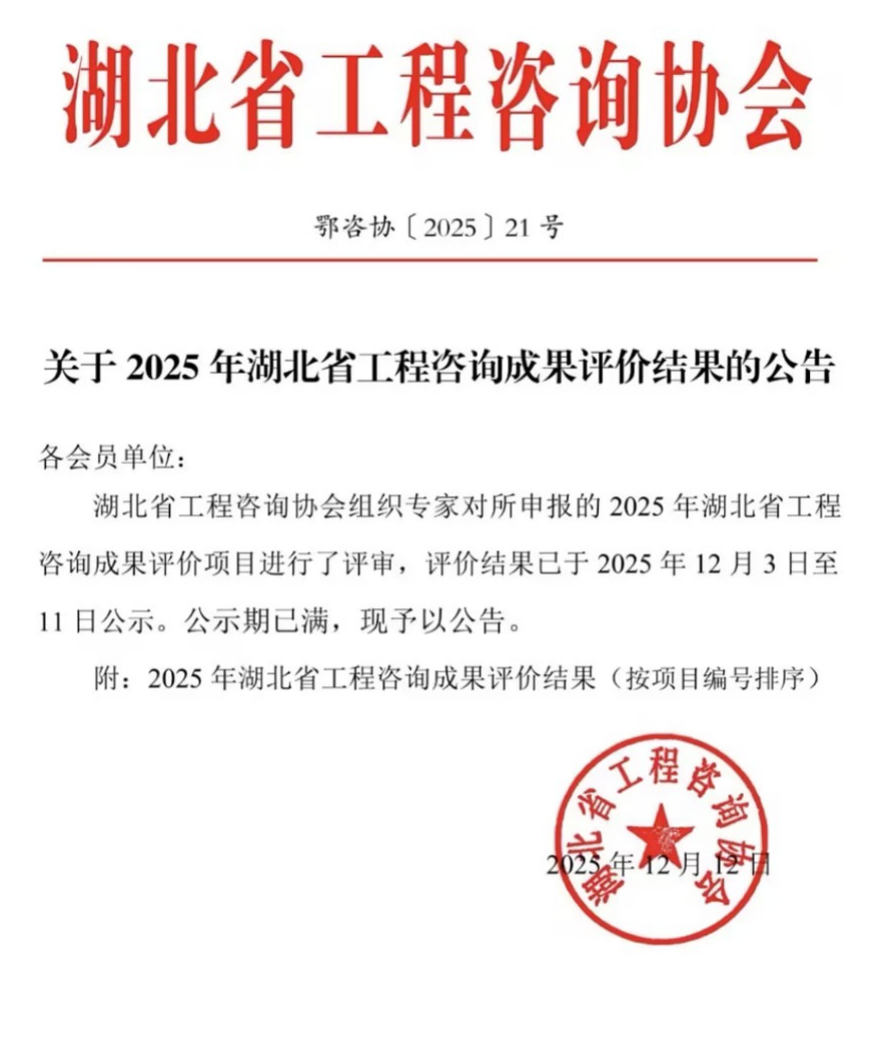 近日,湖北省工程咨询协会发布2025年湖北省工程咨询成果评价结果的公告,永业行凭借深厚的专业功底与创新的咨询理念,共有6项成果获得优秀评价。