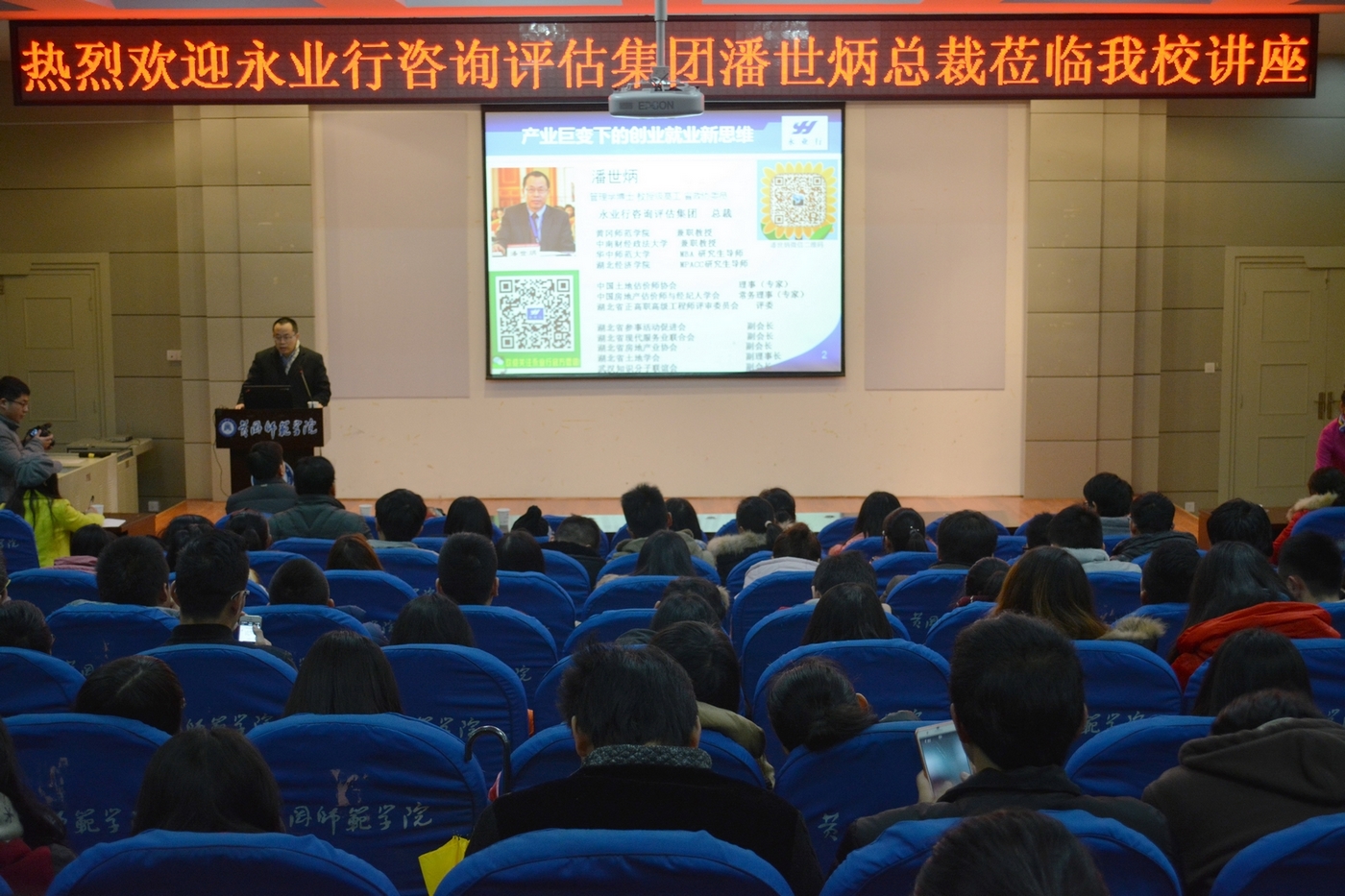 12月24日,应黄冈师范学院商学院的邀请,永业行总裁潘世炳在黄冈师范学院学术报告厅B03室作了题为“产业巨变下的创业就业新思维”的讲座,商学院师生参加了讲座。