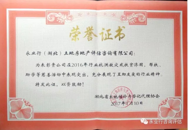 1月10日,湖北省土地估价与登记代理协会三届七次理事会暨2017年新年年会在紫阳湖宾馆举行。会上,永业行获评“湖北省土地评估行业慈善活动先进单位”,并颁发了荣誉证书。