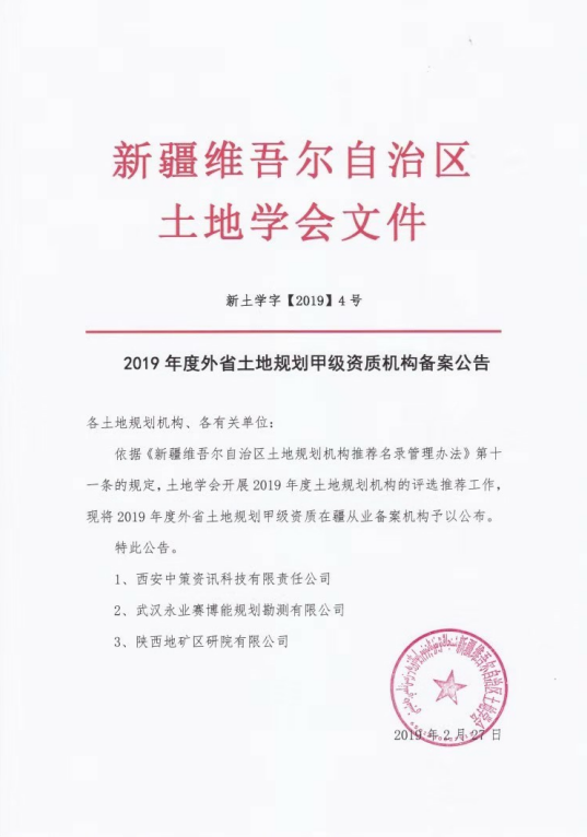 永业行入围新疆维吾尔自治区土地学会2019年度外省土地规划甲级资质机构备案名录