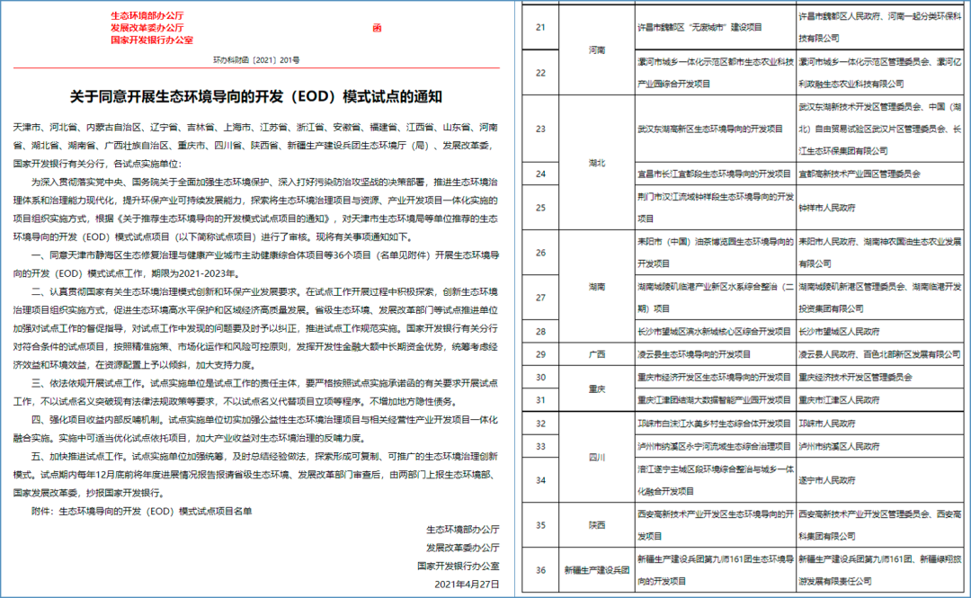 2020年9月,生态环境部与国家发展改革委、国家开发银行为推动EOD模式的实践探索和总结推广,以办公厅函形式联合印发了《关于推荐生态环境导向的开发模式试点项目的通知》(环办科财函〔2020〕489号),向各地区征集EOD模式备选项目。国家开发银行有关分行对符合条件的试点项目,在资源配置上予以倾斜,加大支持。