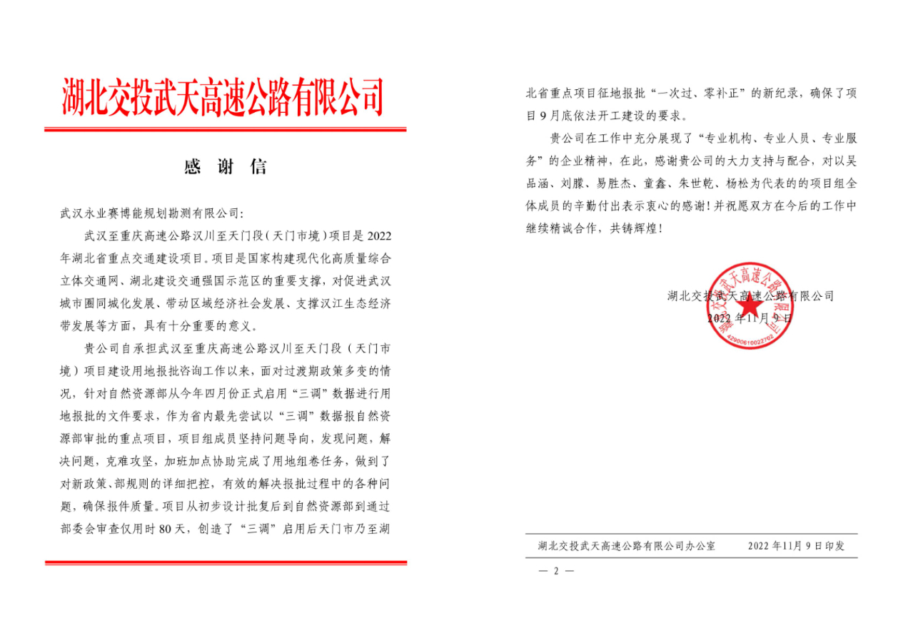 感谢信称,我公司自承担武汉至重庆高速公路汉川至天门段(天门市境)项目建设用地报批工作以来,面对过渡期政策多变的情况,按照自然资源部从今年四月份正式启用“三调”数据进行用地报批的文件要求,作为省内最先尝试以“三调”数据报自然资源部审批的重点项目,项目组成员坚持问题导向,发现问题,解决问题,克难攻坚,加班加点协助完成了用地组卷任务,做到了对新政策、部规则的详细把控,有效的解决报批过程中的各种问题,确保报件质量。项目从初步设计批复后到自然资源部到通过部委会审查仅用时80天,创造了“三调”启用后天门市乃至湖北省重点项目征地报批“一次过、零补正”的新纪录,确保了项目9月底依法开工的建设要求。