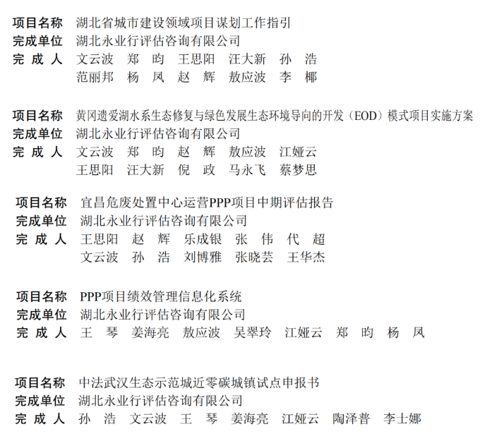 近日,湖北省工程咨询协会发布2022年湖北省工程咨询成果评价结果公告,永业行申报的5项成果均获奖,其中:《湖北省城市建设领域项目谋划工作指引》《黄冈遗爱湖水系生态修复与绿色发展生态环境导向的开发(EOD)模式项目实施方案》《宜昌危废处置中心运营PPP项目中期评估报告》荣获二等奖,《PPP项目绩效管理信息化系统》《中法武汉生态示范城近零碳城镇试点申报书》荣获三等奖。