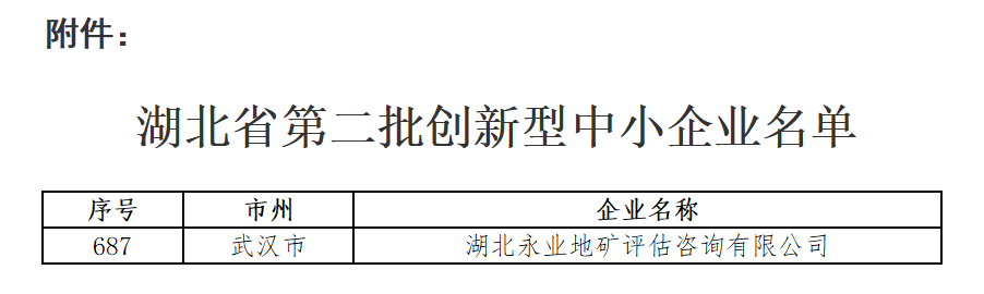 2月27日,湖北省经信厅公布湖北省第二批创新型中小企业名单,永业行成员机构湖北永业地矿评估咨询有限公司位列其中!