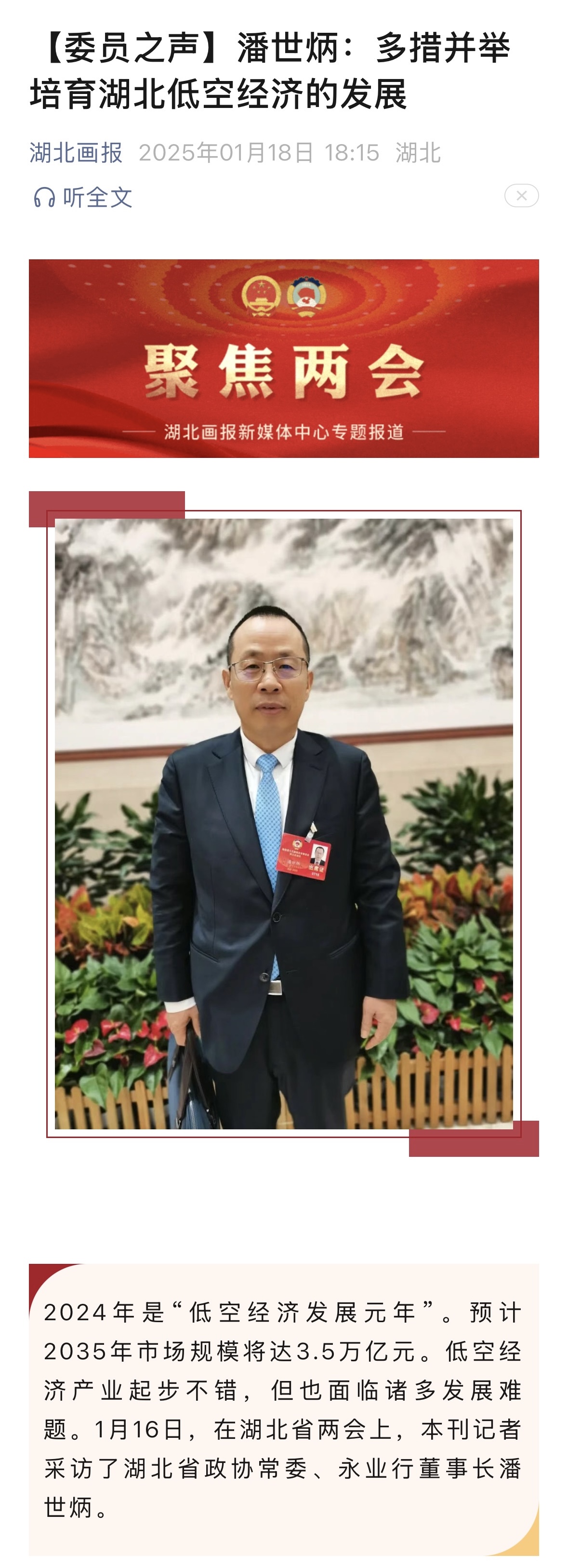 会议期间,潘世炳针对《关于着力培育湖北低空经济的几点建议》接受《中国经营报》、湖北画报记者采访,就低空经济产业面临的诸多发展难题进行深入解析,并结合困扰行业发展的空域“多头管理”与“管理空白”现象提出了建立完善低空经济法规政策及标准体系、构建低空经济规划和协作管理机制、提高低空经济项目谋划推进质量、加强低空经济财税和金融支持、引导发展“低空+”新模式新业态、低空智联和数字风控建设等针对性建议。